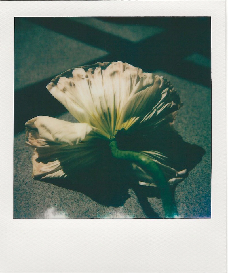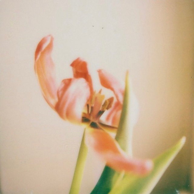 Using my SX-70 Polaroid camera, I document the seasonal flowers in my neighborhood and floral studio. I enjoy this process because it is meditative to sit with the image during the development period. I then respond by taking another portrait, adjusting settings as needed. In my tulip series, I chose a closed tulip to document its unfolding over 24 hours.